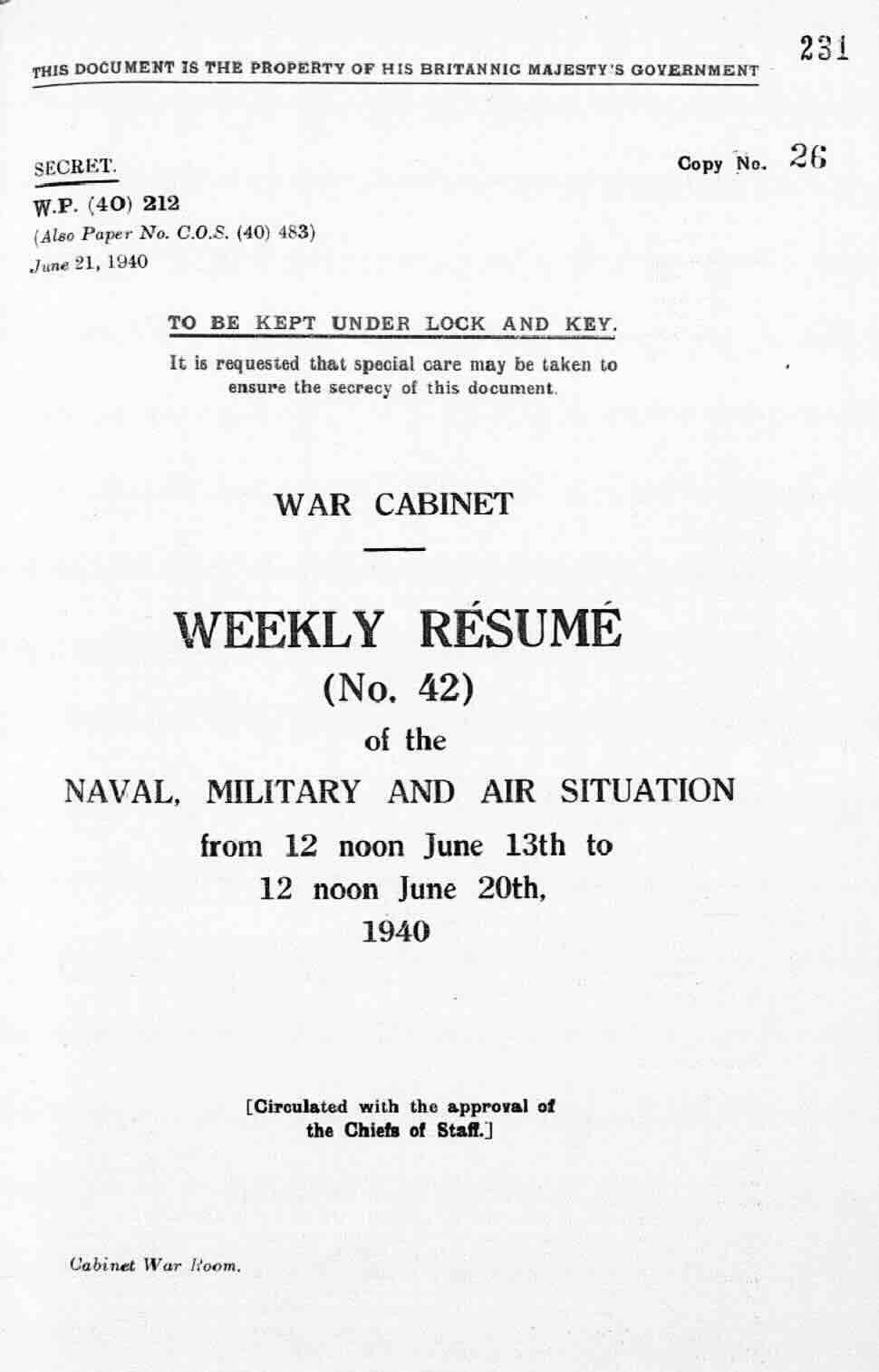 Each week, the War Cabinet in Britain received the Weekly Resume of events for the preceding seven days. These reports on the 'Naval, Military and Air Situation' are a good general guide to the progress of the war, although they would soon encompass a mass of material.