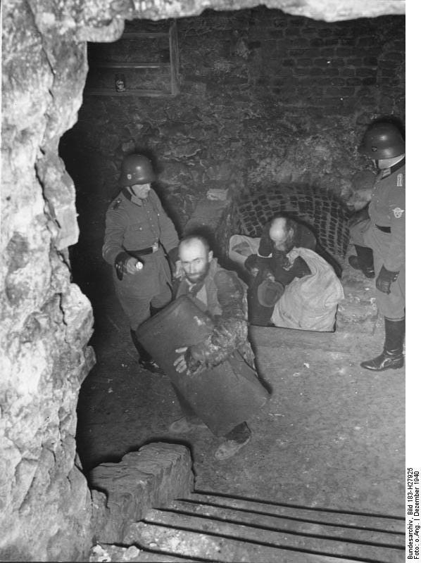 The full explanation for these pictures is not clear. In general, the anti-Semitic propaganda sought to portray the Jewish population as furtive, unclean and somehow despicable. German propaganda explicitly sought to associate them with vermin, a feature of the propaganda film ‘The Eternal Jew’, and that association may lie behind these images. The fact that it was the Germans themselves who had reduced the Jews to a state of destitution made no difference to this logic.