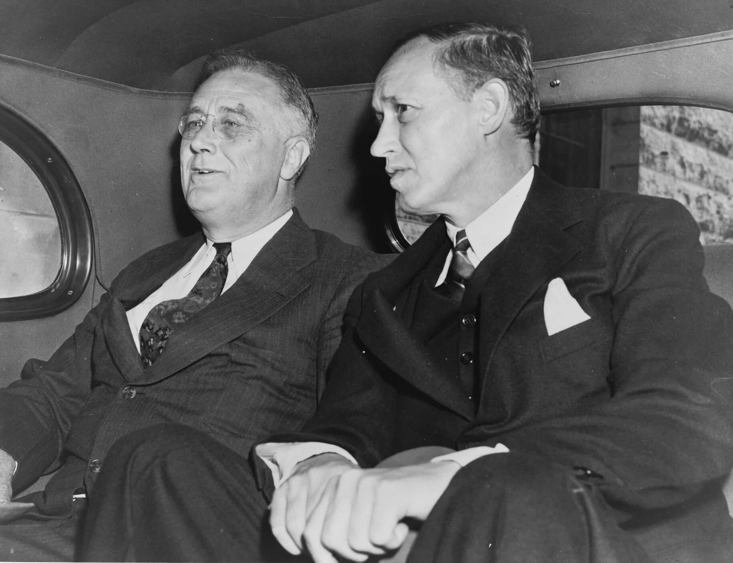 Roosevelt with Hopkins in 1938. They worked closely together on the New Deal relief programme. Hopkins had most of his stomach removed in 1939 after a cancer diagnosis and thereafter struggled to absorb enough food to sustain him.