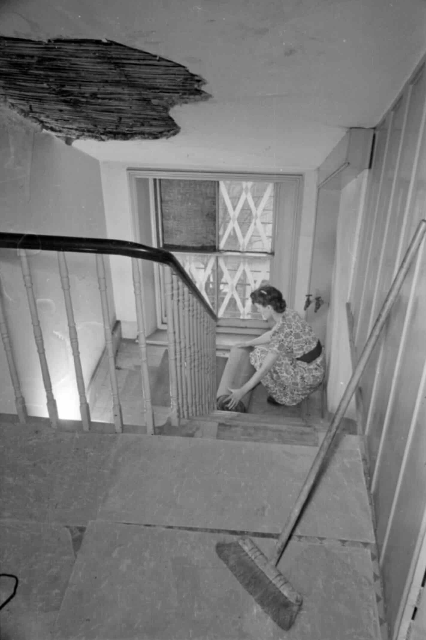 The Ministry of Information produced a Photographic essay - A Day In The Life Of A Wartime Housewife: Everyday Life In London, England - in early 1941. This followed Mrs Day and documented how the war was affecting every household, albeit this example was from an affluent neighbourhood. “Mrs Olive Day rolls away a rug that was on the staircase of her South Kensington home. All carpets have been removed and asbestos laid in their place, in an attempt to combat fire bombs. Behind her, part of the window has been boarded up, with the rest of the panes have criss-crosses of tape across the glass.