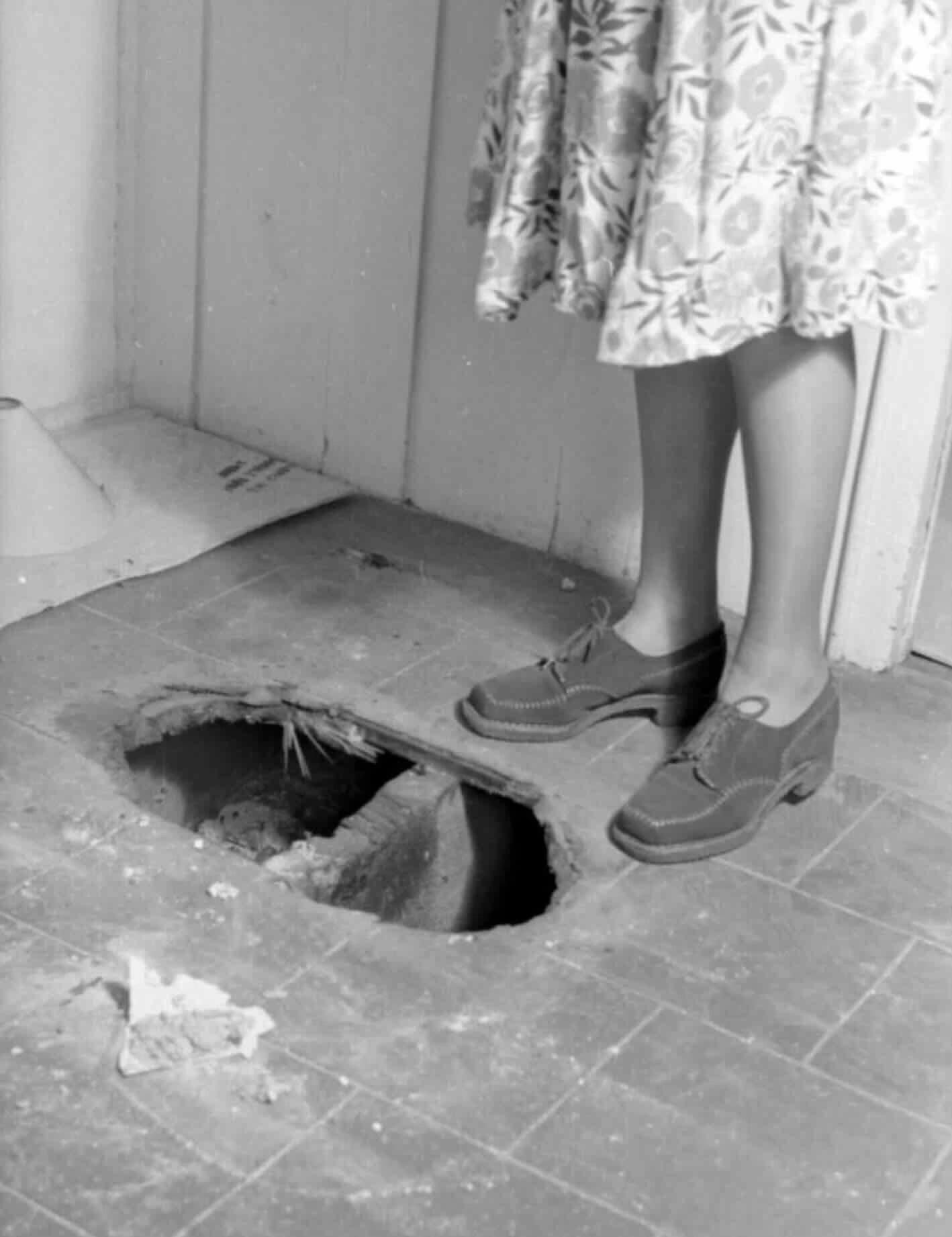 Mrs Day stands alongside a hole in the floor which was made by a fire bomb before the fire was brought under control. This area of the house does not have asbestos sheeting on the floor
