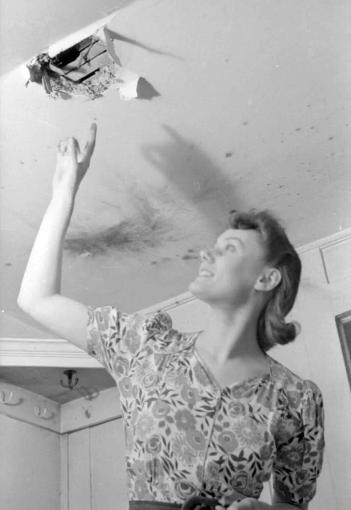 Mrs Day points to a hole in the ceiling where a fire bomb recently came through into her South Kensington home. Scorch marks can be seen on the ceiling next to the hole