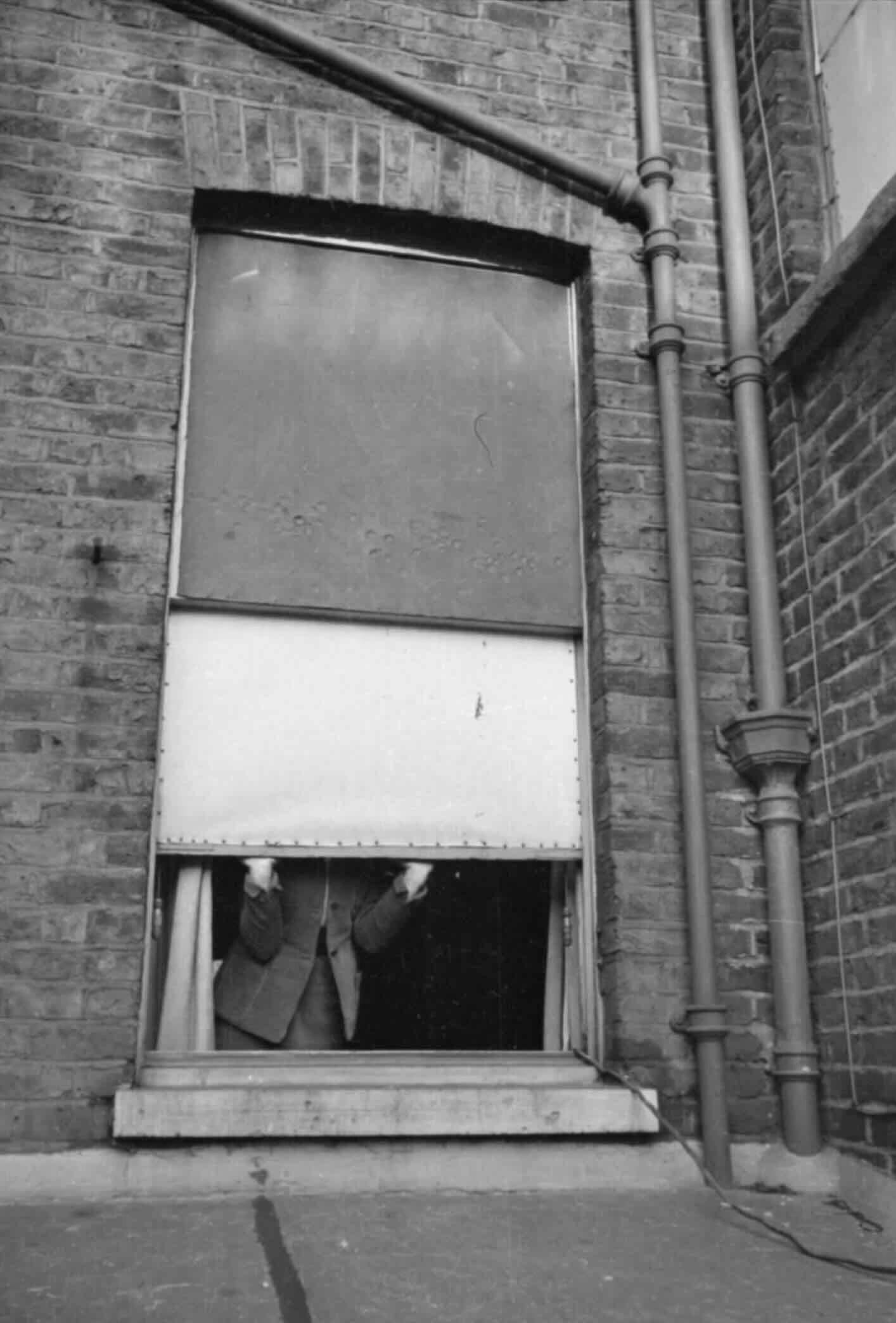 Mrs Olive Day opens her window to let some air, and light, into her South Kensington home. The window panes have been replaced by oiled linen stretched over the frame, as the glass was knocked out by a nearby bomb a short while ago.