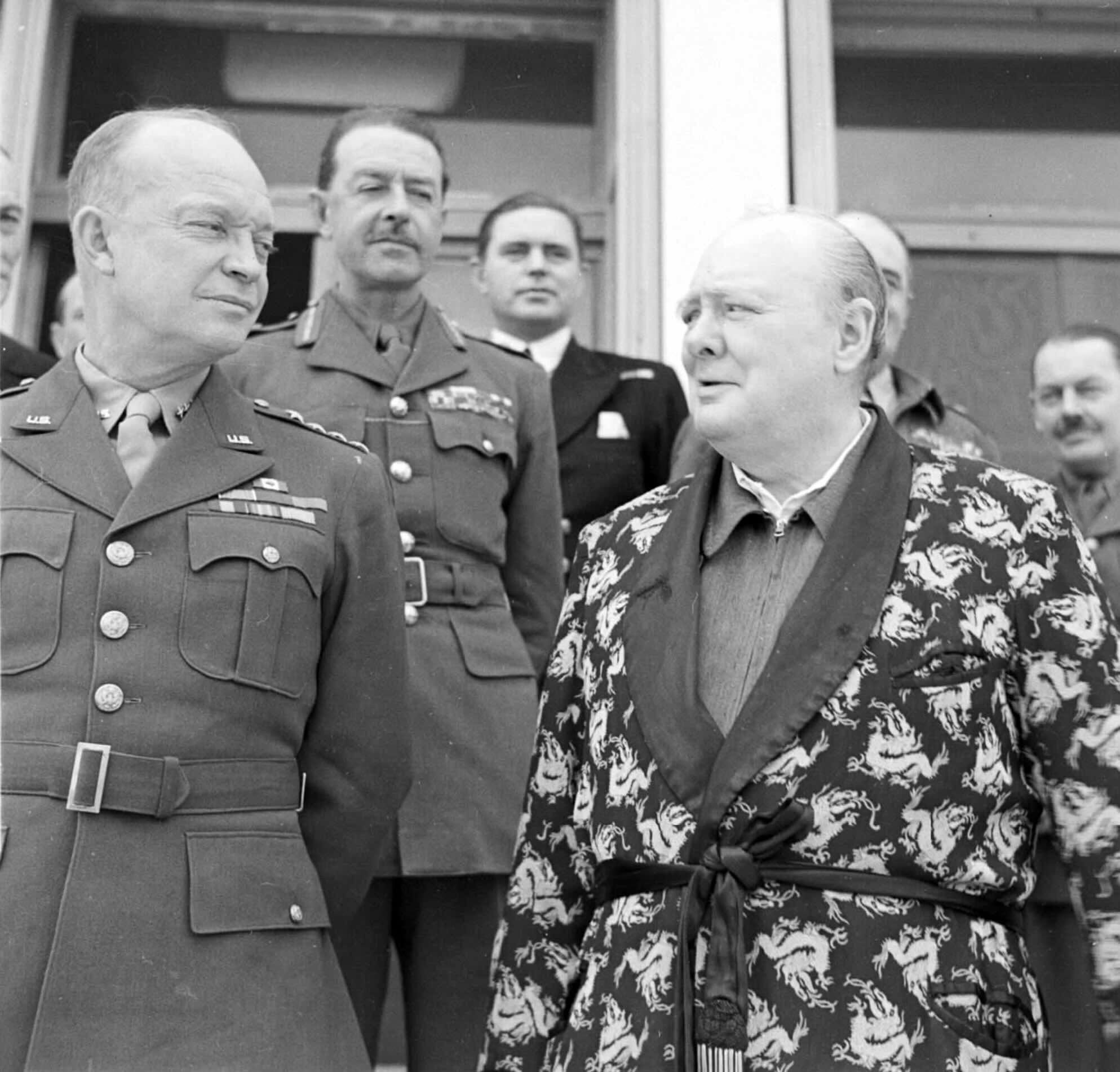 Churchill in his famous dragon dressing gown. A picture taken almost three years later - when the Axis forces had finally been defeated in Africa. ‘The Prime Minister Winston Churchill, dressed in his siren suit and dressing gown, stands beside General Dwight D Eisenhower, with General Harold Alexander behind them, at his headquarters in Tunis, Tunisia,…