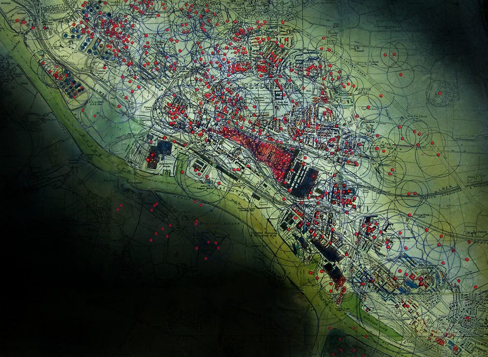 This map, compiled and designed by Tom McKendrick in 1983, is included as part of the artist’s research for the paintings titled “Map” It shows the concentration of bombs in the town of Clydebank by the raids on 13th and 14th March.