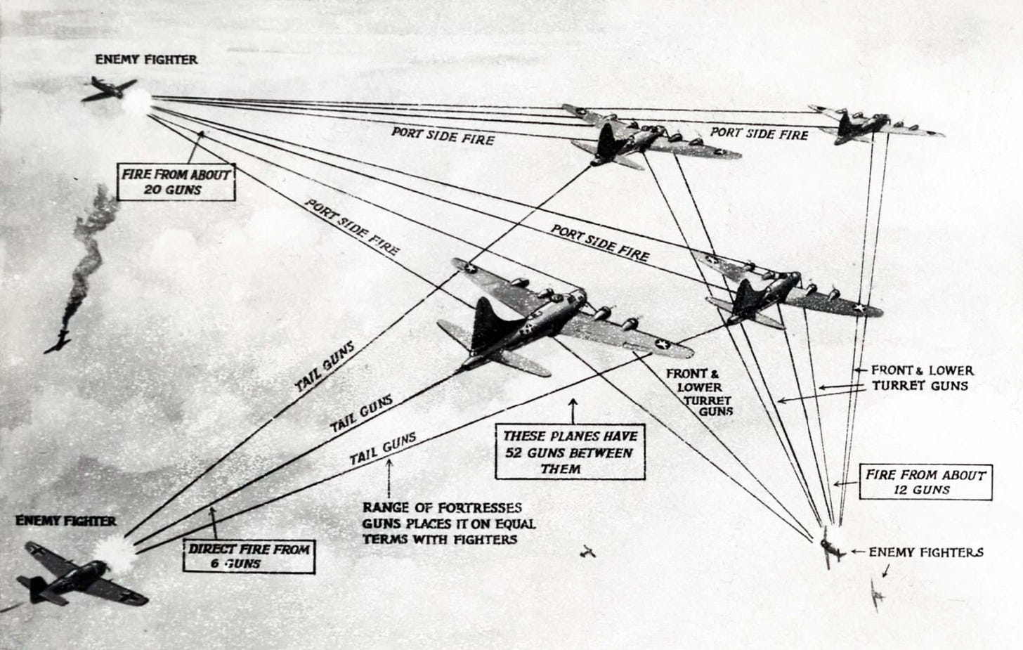 'How The Flying Fortresses Have Achieved Their Astonishing Success Over Enemy Fighters; The Close Formation Flying Which Enables A Group Of Four Bombers To Concentrate A Terrific Fire When Attacked On The Flank, From Below Or From Behind - Drawing by Roland Davies. The Americans, when operating in daylight, fly in formation which enables them to bring a devastating cross-fire to bear, which blasts the enemy out of the sky. With the thirteen guns of heavy calibre with which they are armed, there is hardly a blind spot anywhere. No Fighter, therefore can nip [in] and out without facing deadly fire - which is the deadlier when the calibre of the American guns is taken into account. .5 inch against our own .303. Some U.S. gunner(s) have claimed kills at 600 yards range and more. The .5 inch machine gun fires at the rate of 750 rounds a minute, and it is capable of smashing through all ordinary aircraft armour.' Publicity released in Britain in late 1942.