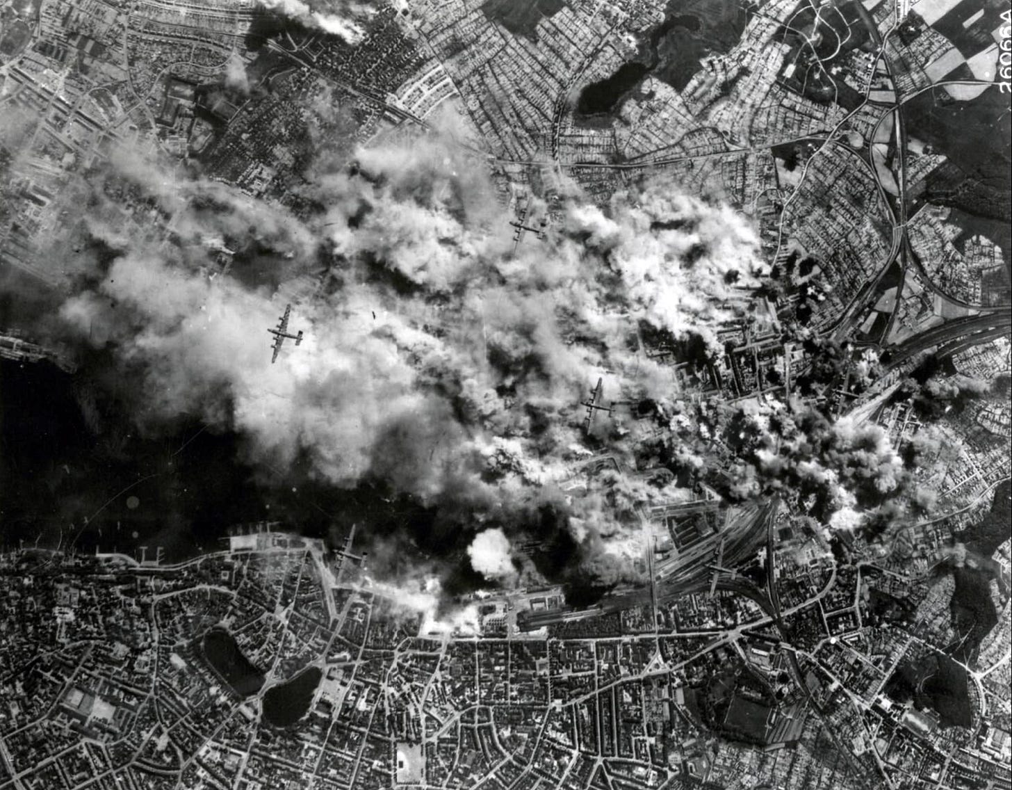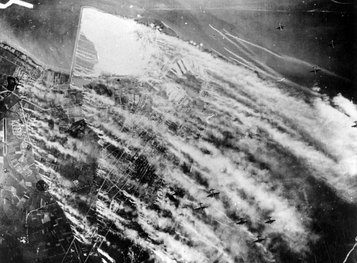 B-17s in formation over the target. ‘B-17 Flying Fortresses of the 4th Bomb Wing leave contrails over Kiel during a mission on 13 June 1943.’ In fact the smoke appears to be from smoke pots lit by German in an attempt to obscure the target.