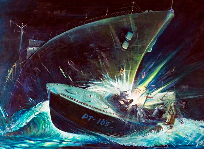 PT 109 was in collision with the Japanese destroyer Amagiri and was sliced in two. Two men died on PT 109 but the survivors managed to swim to the nearest island. They were stranded without supplies and with no means of communicating with base.