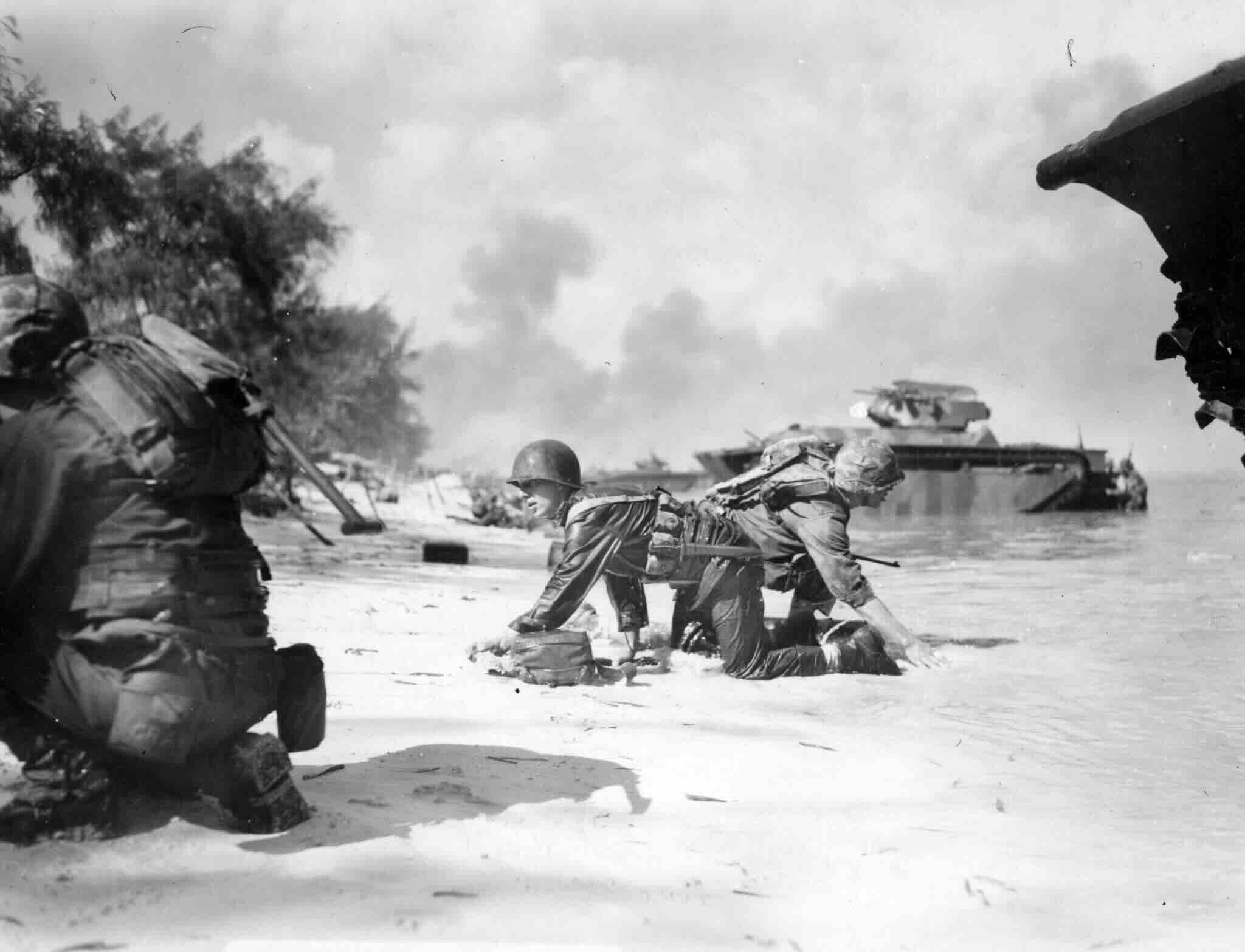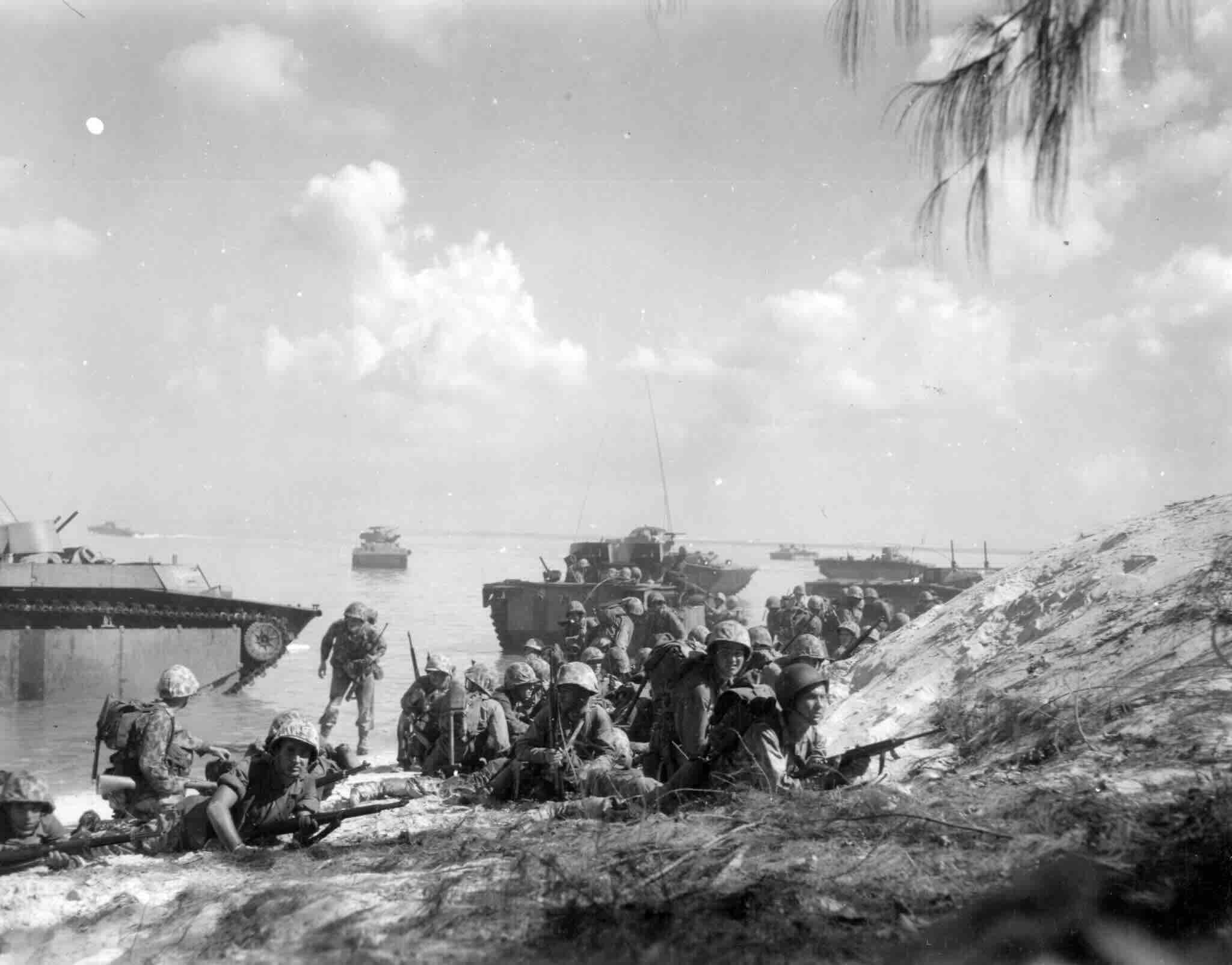 The US Navy launches another invasion - as the island hopping in the Pacific continues. For this amphibious assault they had brought 77,000 men, about half the force that landed on D-Day in Europe. But this time they had travelled rather further than across the English Channel, where the direct route was around a 100 miles.