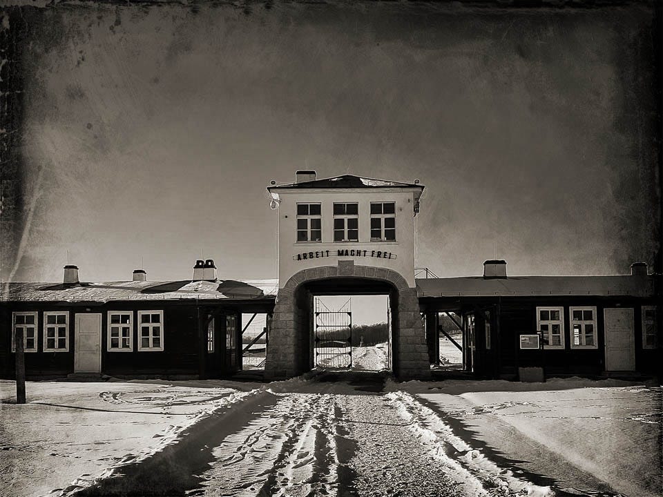 Days later the train came to a halt. As we got off the train, we were ironically greeted by a marching band. We passed through a gate, above which was a large sign which said "ARBEIT MACHT FREI" (Work Will Make You Free). The electrified barbed wire fence with the watchtowers and armed guards did not indicate that there was any way to become free from that place. In my first conversation with the "Veteran" residents I learned that I was now in Gross Rosen Concentration Camp. They assured me that one entered this place through the gate, but that the only way I, or anyone, would leave would be through the crematorium chimney.